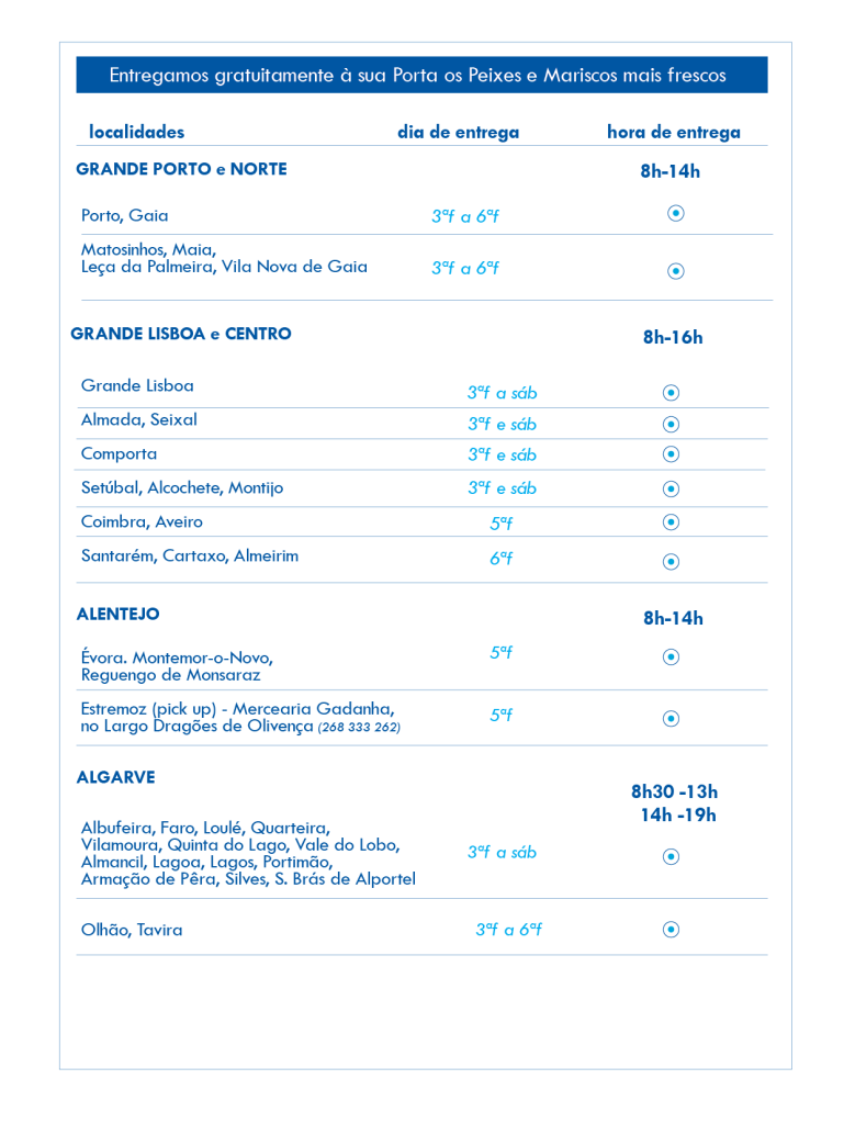 É um serviço de conveniência com entregas gratuitas* ao domicílio de peixe fresco de alta qualidade, marisco e produtos do mar frescos e congelados. Todos os produtos são preparados, embalados e transportados em excelentes condições de higiene e segurança alimentar.